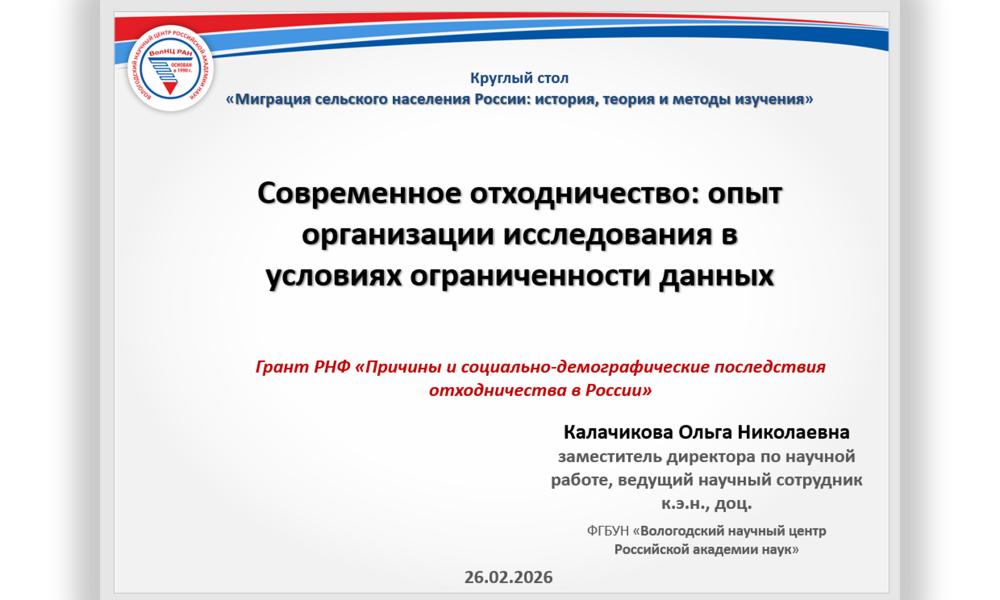 26 февраля 2026 г. на базе Института социальной демографии ФНИСЦ РАН. (г. Москва) состоялось очередное заседание Круглого стола «Миграция сельского населения России: история, теория и методы изучения». В его работе приняли участие сотрудники ИСД ФНИСЦ РАН, Института социально-экономических исследований Дагестанского федерального исследовательского центра РАН и другие. Вологодский научный центр РАН представила заместитель директора по научной работе ВолНЦ РАН, в.н.с. к.э.н., доцент Ольга Николаевна Калачикова, которая представила доклад «Современное отходничество: опыт организации исследования в условиях ограниченности данных».