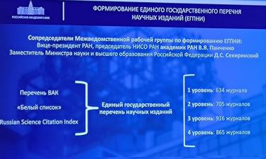Заместитель директора Российского центра научной информации Андрей Евгеньевич Гуськов презентовал информационную систему «Метафора», в которой надлежит зарегистрироваться всем журналам, включенным в Единый государственный перечень научных изданий. Система разработана в РЦНИ для сбора информации о научных статьях в российских журналах с целью создать общедоступный реестр метаданных публикаций российской научной периодики.