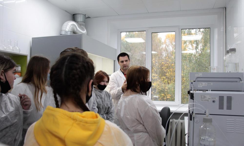 В рамках проведенной Вологодским научным центром РАН экскурсии младший научный сотрудник лаборатории И.В. Артамонов рассказал школьникам об истории появления данного метода, его возможностях и провел хроматографический анализ на примере бумажной хроматографии (подобный эксперимент можно проводить в условиях школы) и работы ВЭЖХ-системы. Учащиеся увидели настоящее разделение веществ на хроматографе в ходе анализа различных напитков на содержание кофеина.